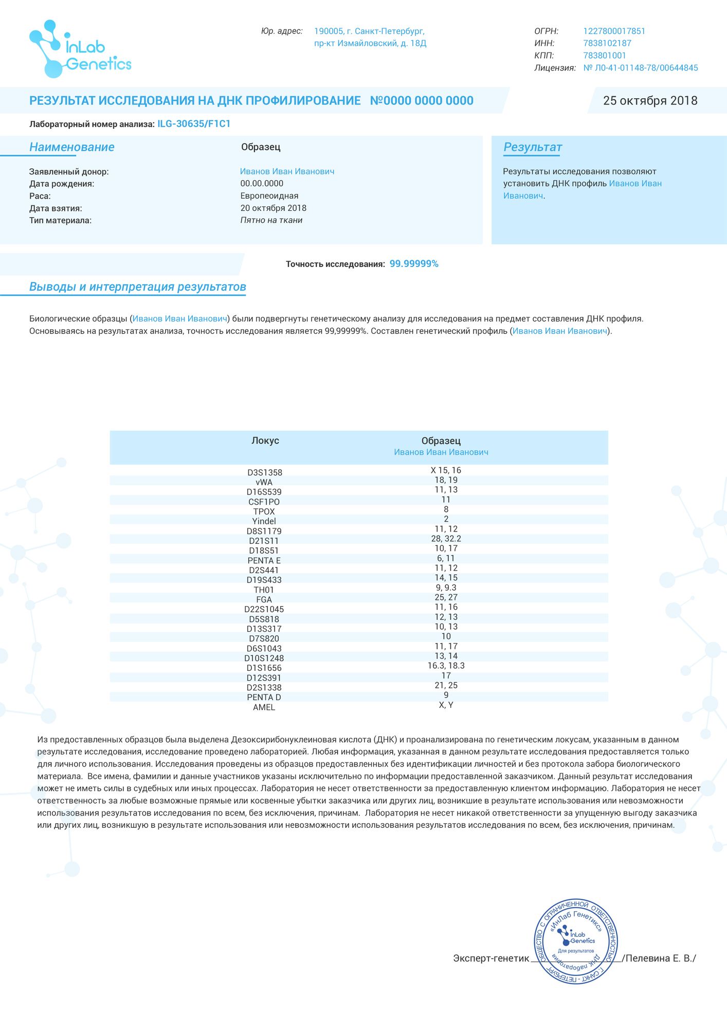 На сегодняшний день генетическая экспертиза тела или останков — это самый современный и точный метод ДНК анализа, точность достигает 99,99999%.